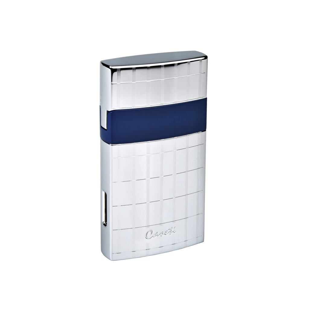 Elegantní tryskový zapalovač Caseti. Kvalitně zpracovaný kovový turbo zapalovač má povrch v lesklém chromovém provedení zdobený jemnými gravírovanými proužky a modrým pruhem po obvodu.