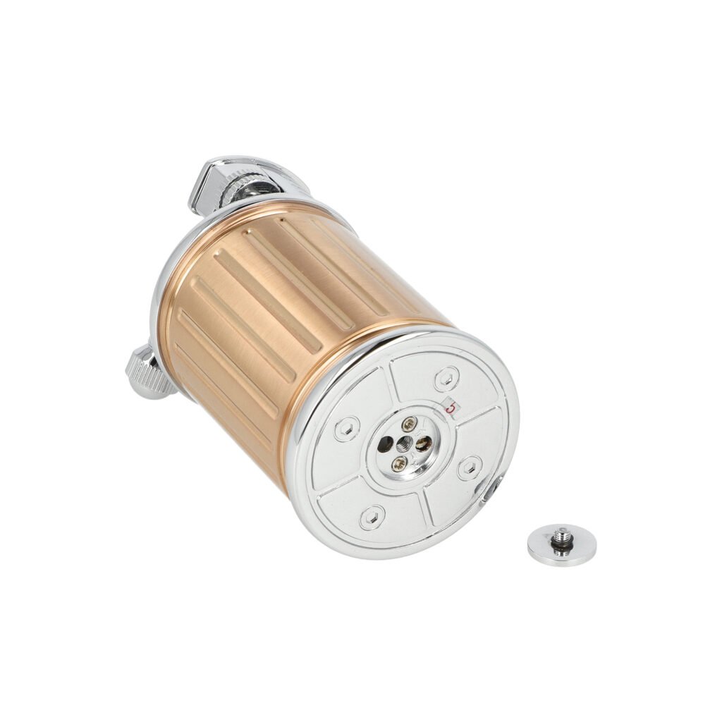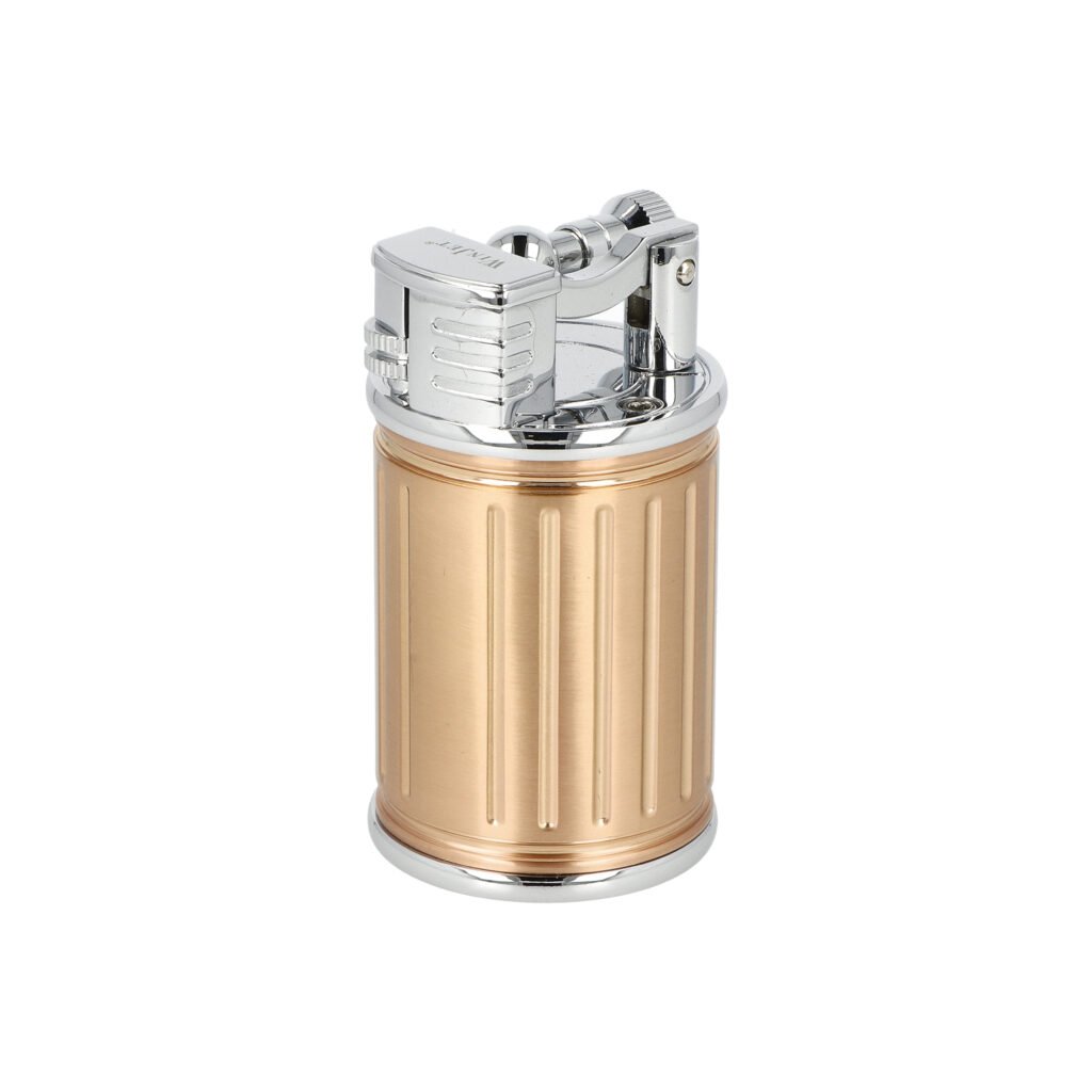 Stolní kovový zapalovač v atraktivním designu v růžovo zlatém broušeném provedení s prvky v leštěném chromu.