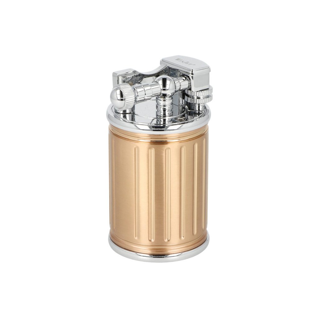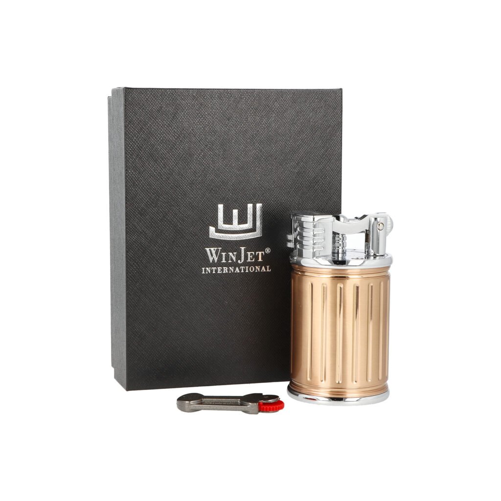 Stolní zapalovač Winjet Stein s kamínkovým zapalováním a normálním plamenem. Kovový zapalovač v atraktivním designu v růžovo zlatém broušeném provedení s prvky v leštěném chromu. Kamínkový zapalovač je precizně vyrobený z kvalitních materiálů. Pro zapálení plamene odklopíme horní kryt hořáku. Tím dojde k otevření plynu - je slyšet ucházející plyn a škrtacím válcem otočíme zprava doleva. Pro zhasnutí plamene stačí přiklopit zpět kryt hořáku nebo plamen jednoduše sfouknout. Na spodní straně zapalovače pod šroubovacím krytem najdeme plnící ventil a ovládání intenzity plamene. K výměně kamínku slouží šroubovací "ozubené" kolečko na levé straně zapalovač. Kolečko vyšroubujeme, vyndáme tyčku s pružinkou a kamínek vyměníme. Vše pak vrátíme zpět a opět zašroubujeme.