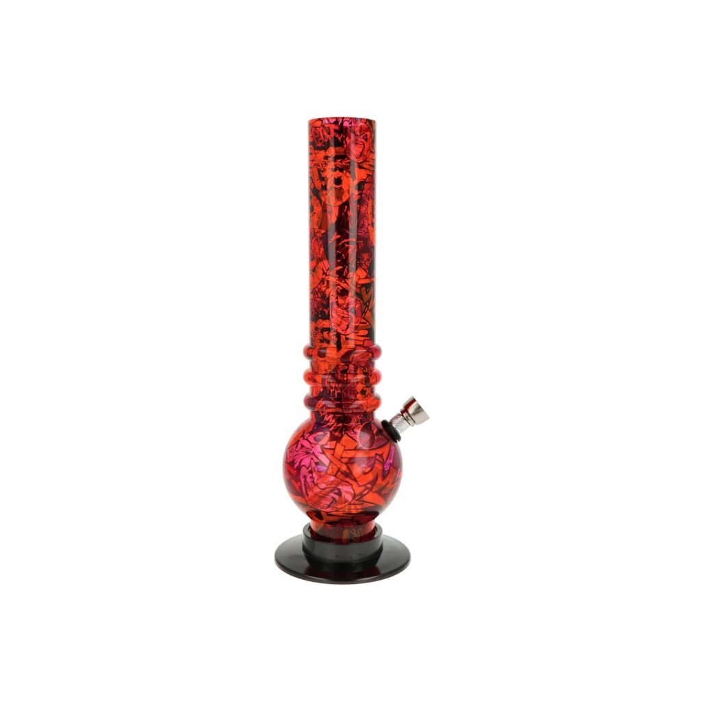 Akrylový bong Graffiti. Transparentní červený bong s potištěným povrchem atraktivním motivem Graffiti. Rovný akrylový bong je vyrobený z tvrzeného plastu tloušťky 2,5 mm. Plastový bong je vybavený kovovým dvoudílným chillumem se šroubovacím kotlíkem se sítkem.