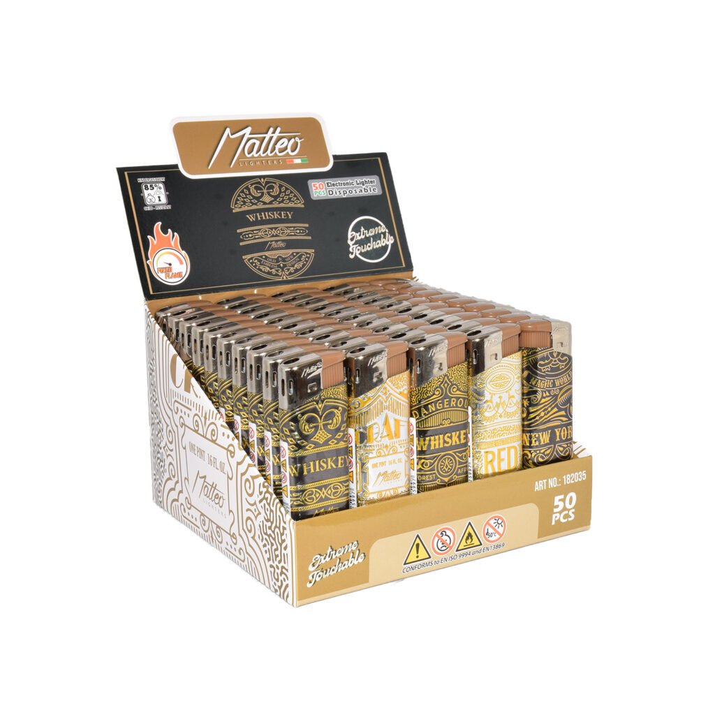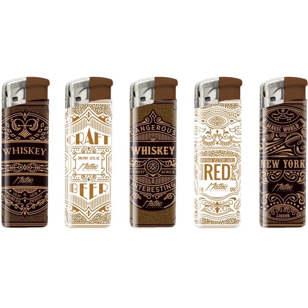 Plynový zapalovač Matteo Piezo Whiskey. U zapalovače nelze měnit výšku plamene, zapalovač není plnící. Výška zapalovače 8 cm.