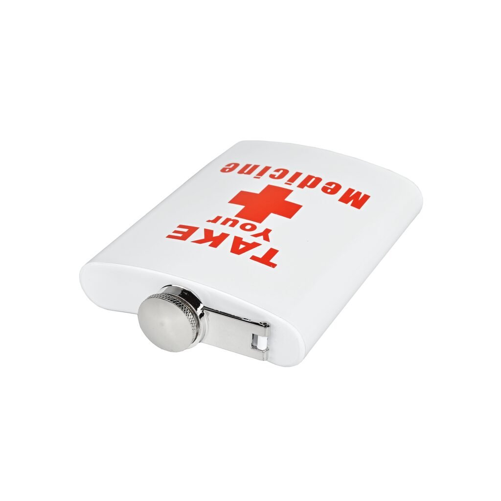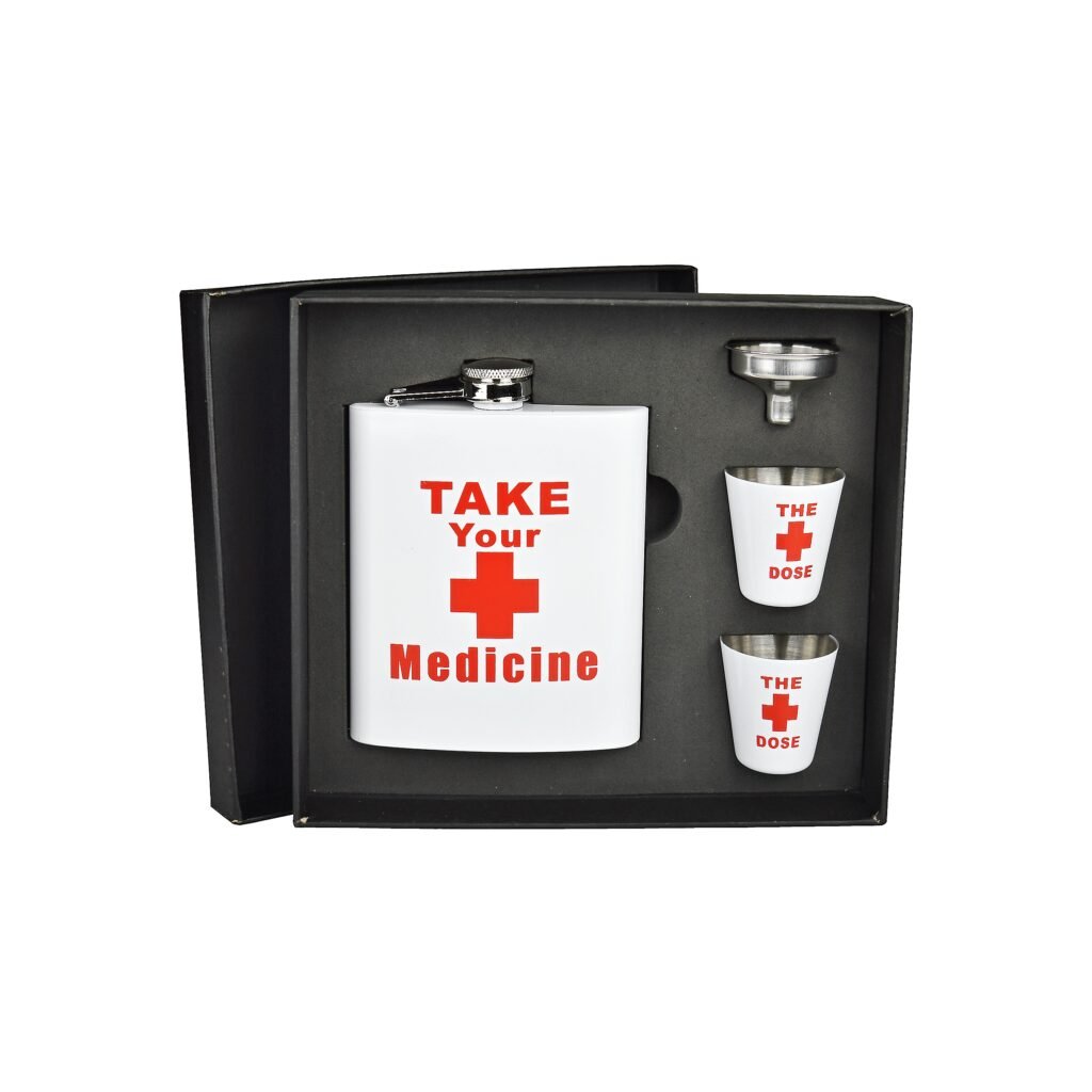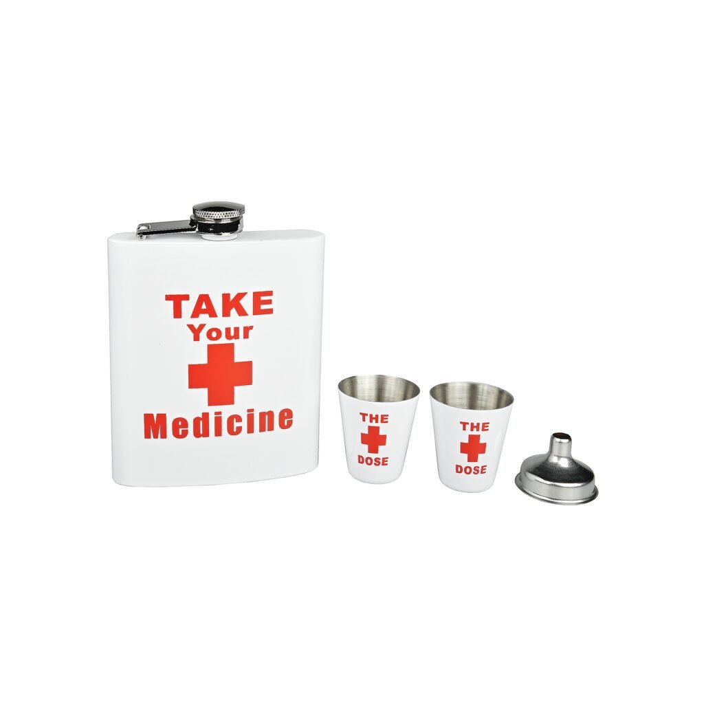Dárková sada placatka na alkohol (likérka) Take Your Medicine s pohárky. Likérka je vyrobená z kvalitního nerezové plechu a její povrch je v pololesklém bílém provedení s červeným motivem. V této atraktivní placatce budete mít vždy vaše oblíbené pití při sobě. Obsah sady: likérka, 2 pohárky, nálevka.