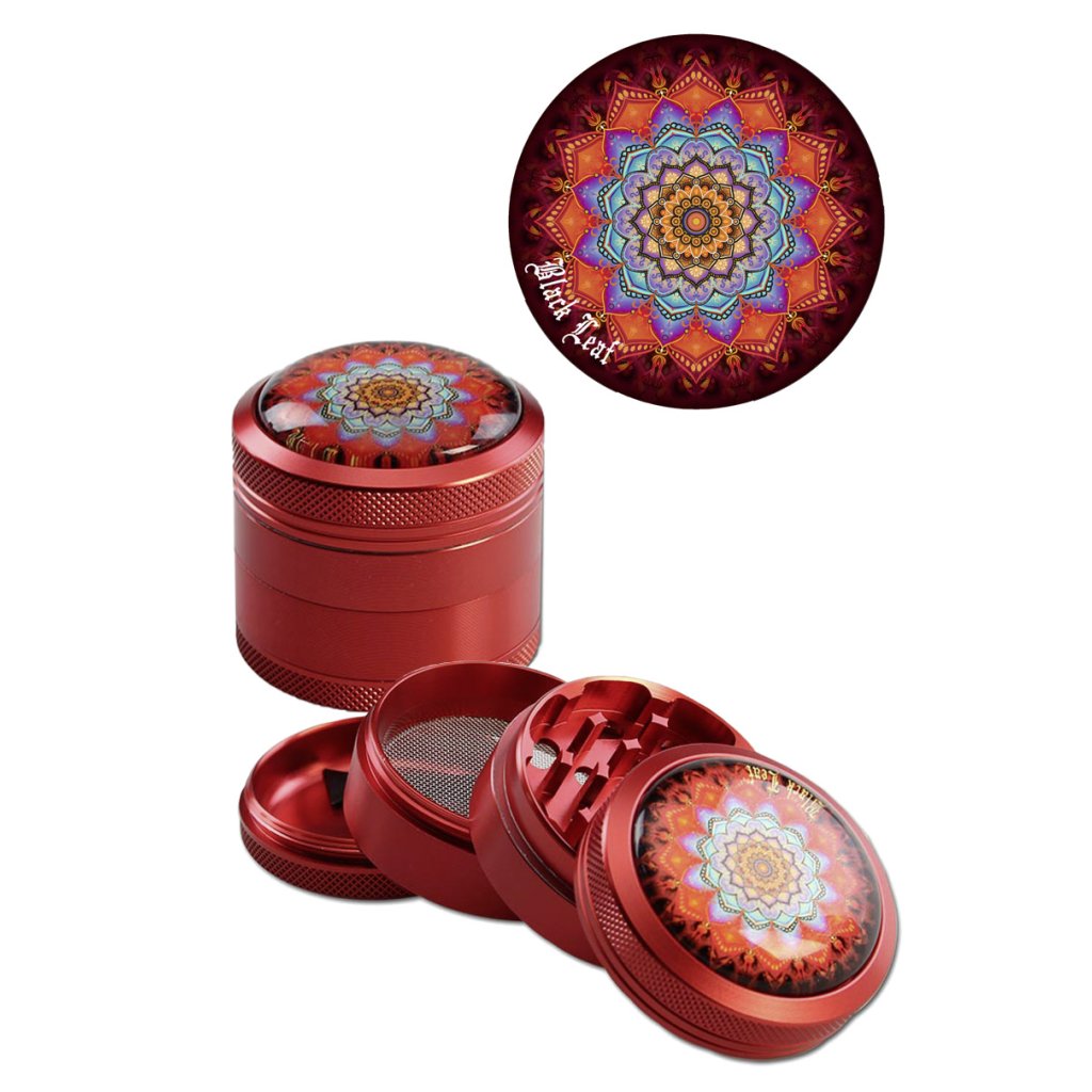 4-dílná drtička od Black Leaf® je vyrobena z eloxovaného leteckého hliníku. Ve víku je okouzlující motiv mandaly, který se skrz skleněnou kupoli projevuje velmi živě.