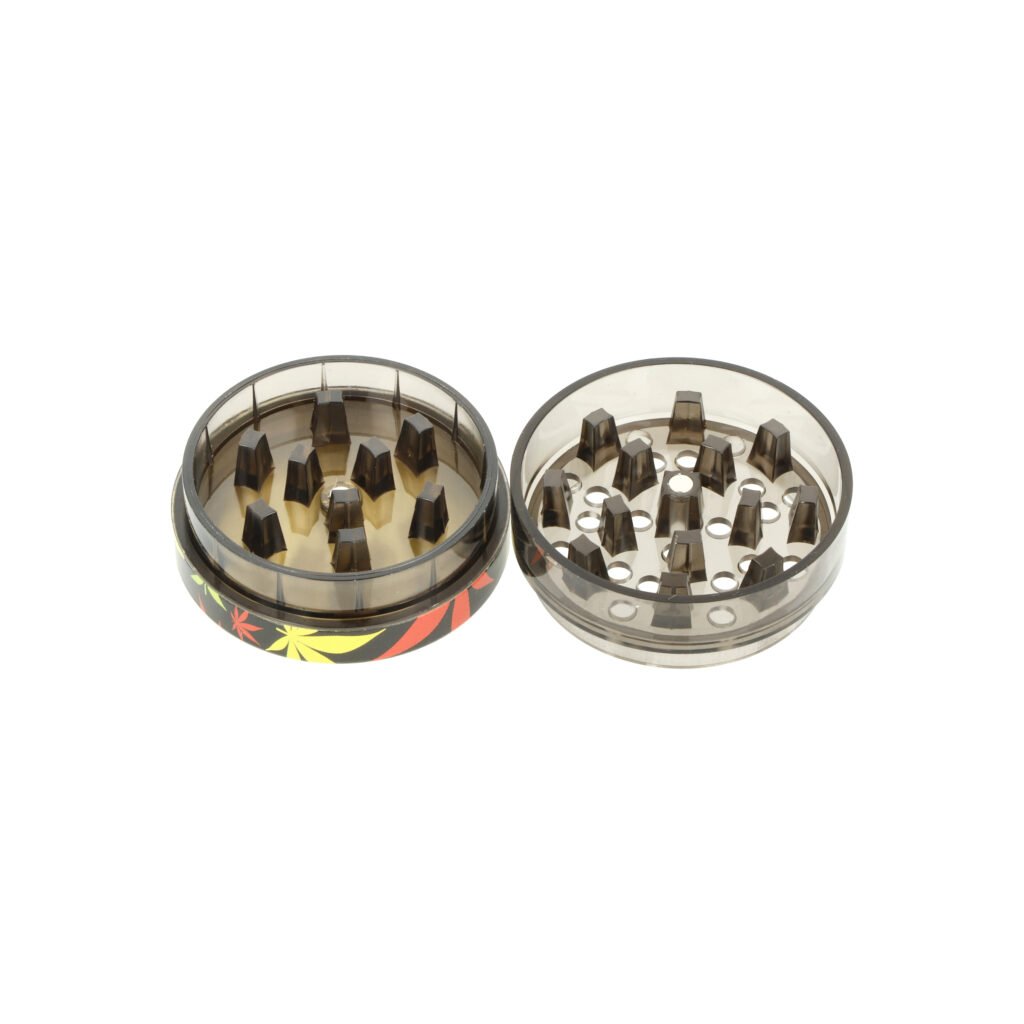 Plastový drtič tabáku a bylin Dreamliner Colored Leaves. Třídílná plastová drtička konopí a jiných bylinek se sítkem a zásobníkem je vyrobena z tvrzeného plastu. Drtič v černé barvě s transparentní drtící částí má povrch v lesklém provedení a celý je zdobený barevnými listy konopí a číslem 420. Jednotlivé díly drtičky na tabák jsou spojené zasunutím do sebe. Víčko a drtící část je spojena na magnet. Plastové ostří ve tvaru obdélníku a jeho ostré hrany nadrtí tabákovou nebo bylinou směs do požadované hrubosti. Drtička je dodávaná v kartonové krabičce.