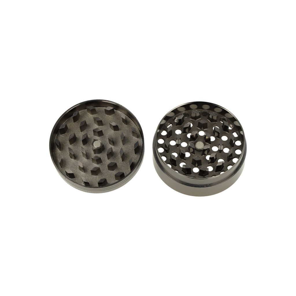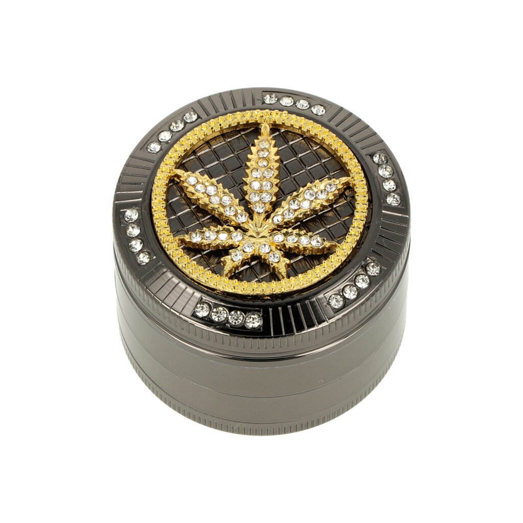 Atraktivní kovová drtička tabáku a bylin Super Heroes Leafdesign. Čtyřdílný hliníkový drtič konopí a dalších bylinek se závitem, sítkem a zásobníkem je vyroben z eloxovaného hliníku CNC technologií. Drtička v gunmetalovém provedení má hladký lesklý povrch. Víčko zdobené listem konopí ve zlaté barvě doplňují broušené kamínky. Drtící část se zásobníkem je pevně spojená na závit, víčko na magnet. Toto zajišťuje pohodlné používání drtiče a současně pevný spoj. Broušené ostří nožů ve tvaru diamantu velmi jemně nadrtí vaši směs do požadované hrubosti. Drtič je dodávaný v kartonové krabičce.