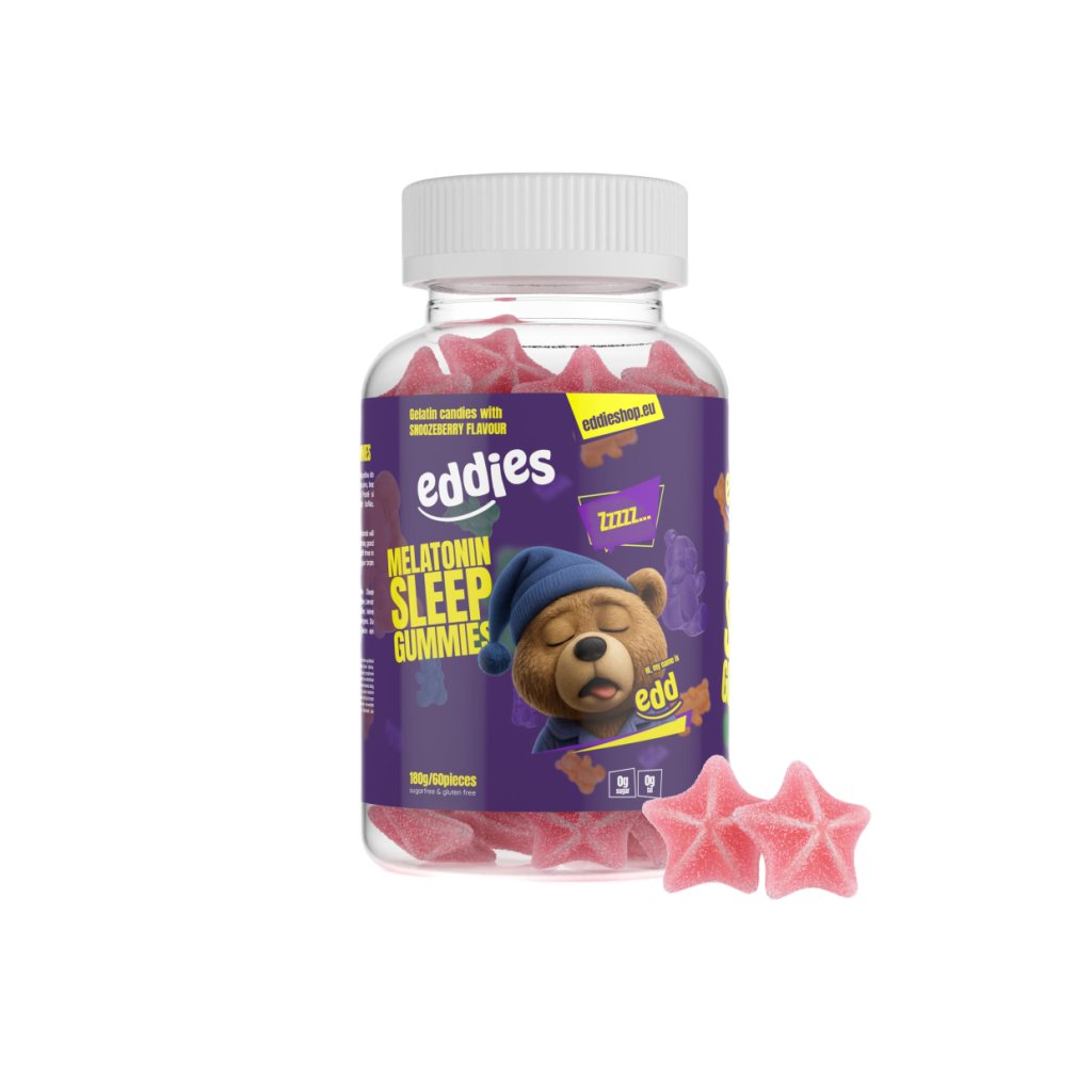 Eddies Sleep Gummies přinášejí 0,5 mg melatoninu v denní dávce- 1/2 gumídka, který ti pomůže usnout rychleji a probudit se svěží – bez těžké hlavy, bez návykovosti a bez polykání tablet.