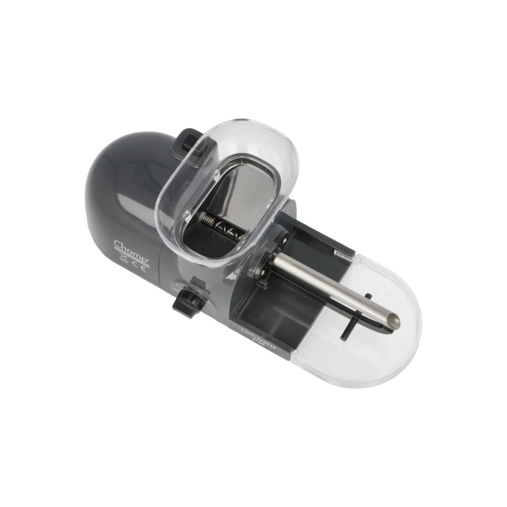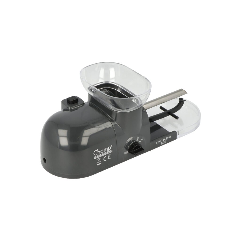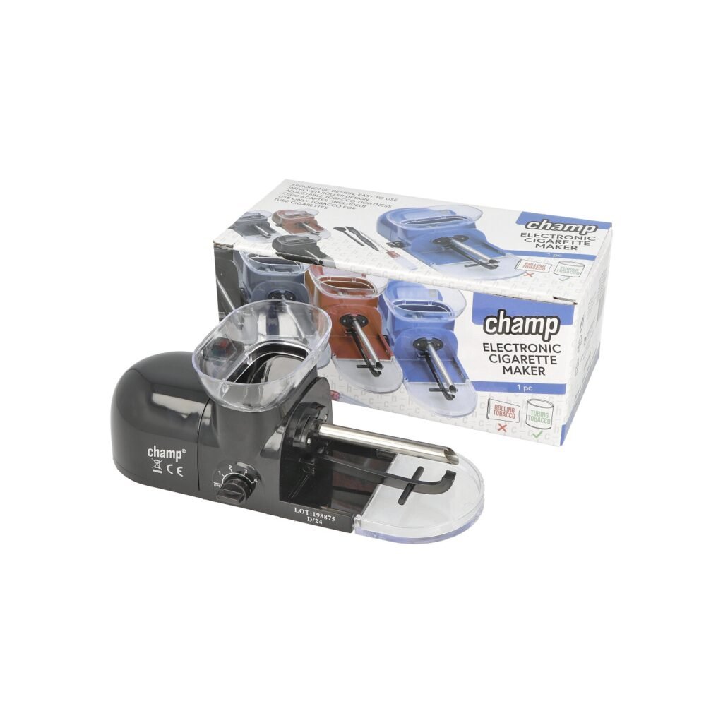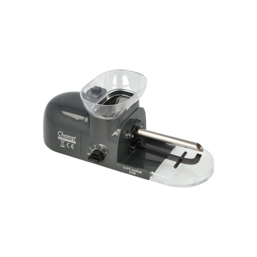 Elektrická plnička cigaretových dutinek Champ. Kompaktní elektrická cigaretová plnička je určená pro plnění dutinek klasické velikosti King Size - průměr 8 mm běžné délky, které jsou plněné pomocí kovové spirály. Jak jsme zvyklí u ostatních elektrických plniček, tak i tato plní dutinky po jednom kusu. Plnička je vyrobená z tvrzeného plastu v lesklém provedení. Na horní straně najdeme odnímatelný zásobník na tabák a ovládací tlačítko plnění. Na čelní straně plničky je umístěný přepínač, kterým nastavíme sílu přítlaku držáku dutinky na trnu - díky tomuto je možné dutinku naplnit různým množstvím tabáku (méně či více ji napěchovat). V pravé části se nachází plnící prostor s trnem a držákem dutinky. Na levém boku najdeme konektor pro napájecí adaptér. Spodní strana plničky je vybavená jemnou látkou, která zabraňuje poškrábání povrchu, na kterém je plnička položena. Elektrická plnička cigaret Champ je dodávaná s praktickým příslušenstvím k údržbě a čistění, které Vám pomůže udržet plničku ve skvělé kondici.