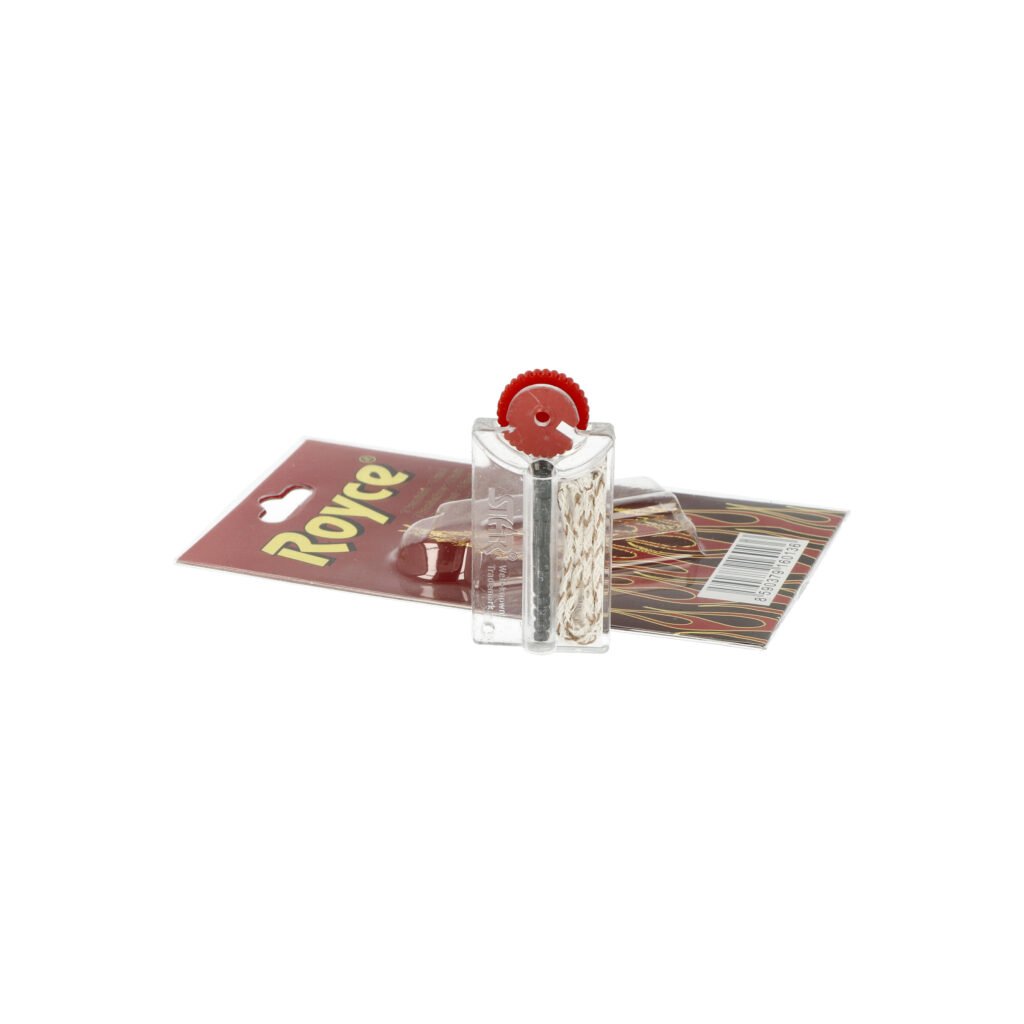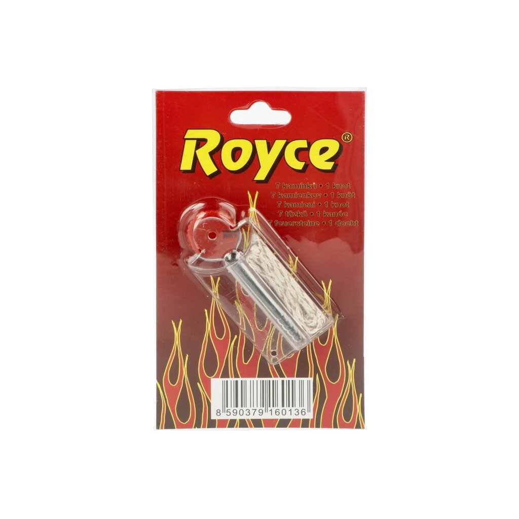 Kamínky a knoty Royce do benzínových zapalovačů. Jedno balení - plastový zásobník obsahuje 7 kamínků do zapalovače a knot s drátkem o délce cca 10cm, jehož délku si upravíte dle potřeby.
