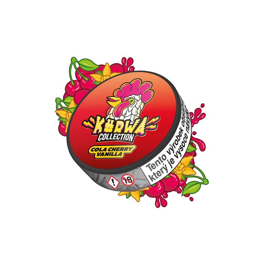Nikotinové sáčky Kurwa Collection - Cola Cherry Vanilla. Tato unikátní kombinace dokonale zralých třešní, extra sladké vanilky a svěžestí coly vás zcela pohltí. Ideální volba pro každodenní užití!
