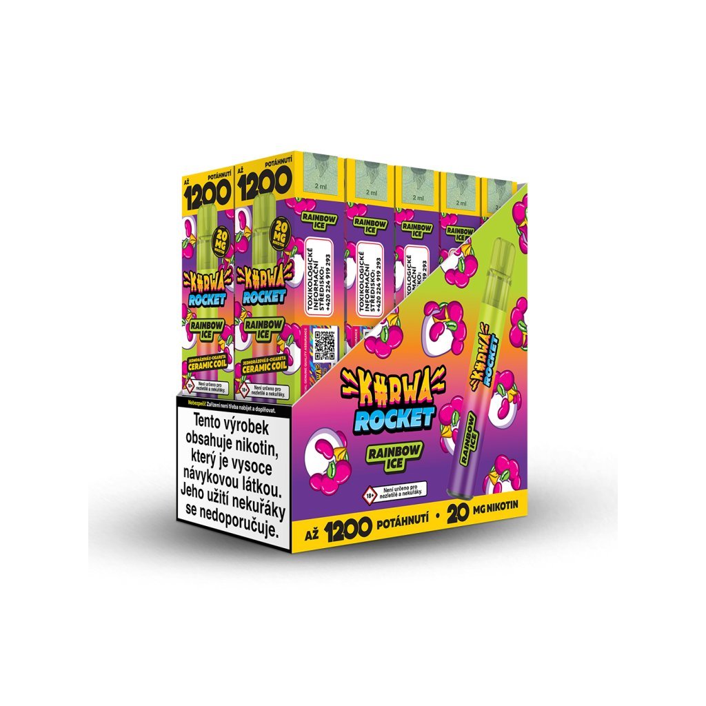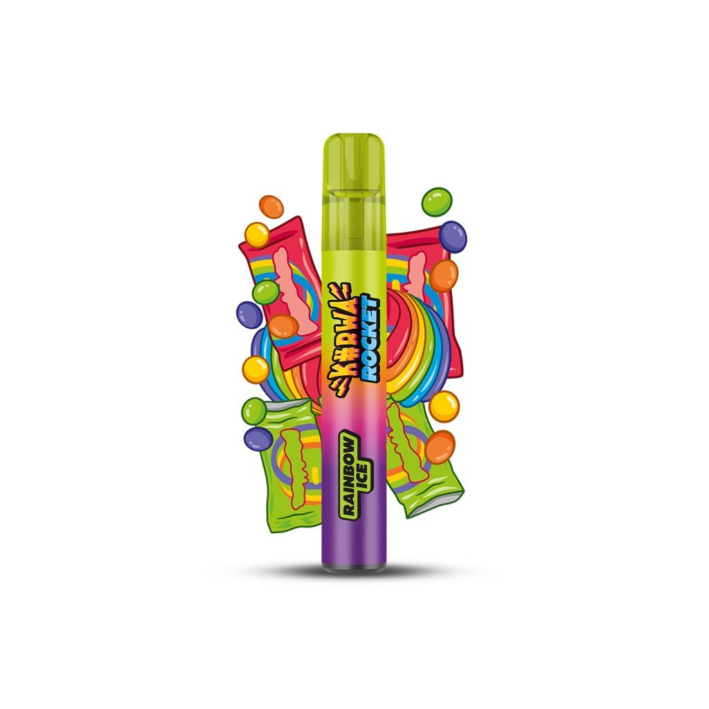 Rainbow s ovocnou chutí bonbónů Skittles ve které se skrývájí tóny limetky, maliny, pomeranče, hroznového vína, jahod a citrusů. Kurwa Rocket je jednorázová e-cigareta s obrovskou výdrží až 1200 potahů. Díky tak velké výdrží disponuje zejména kvůli keramické žhavící cívce a tedy rovnoměrnému a pozvolnému odpařování e-liquidu. Keramická cívka také mnohem lépe přenáší chuť a vytváří hustší páru.