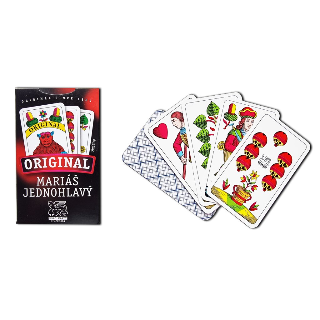 Mariášové jednohlavé karty v papírové krabičce. Zadní strana karet je s káro vzorem. Balení obsahuje 32 karet.