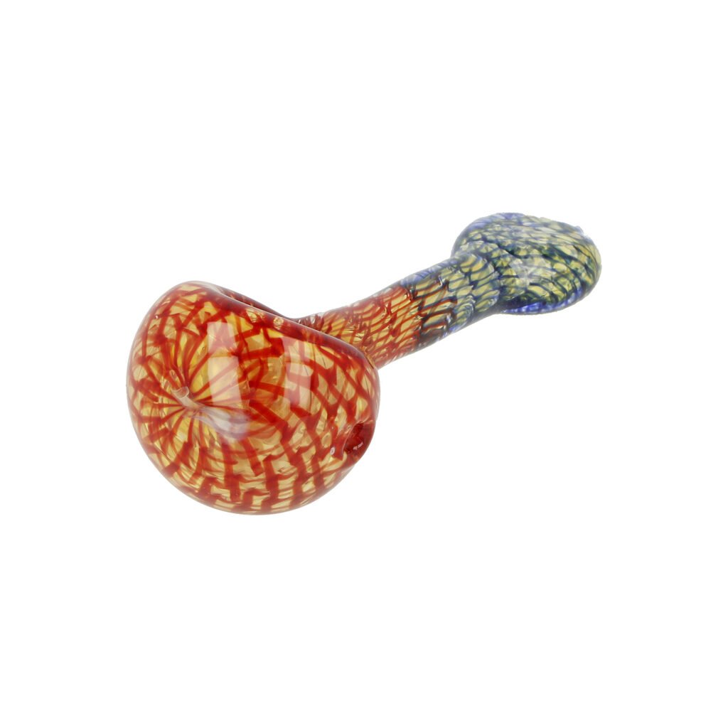 Skleněná šlukovka Pyrex Síť s turbem. Menší odolná skleněná dýmka v modro oranžovém tónu je zdobená síťovaným vzorem.