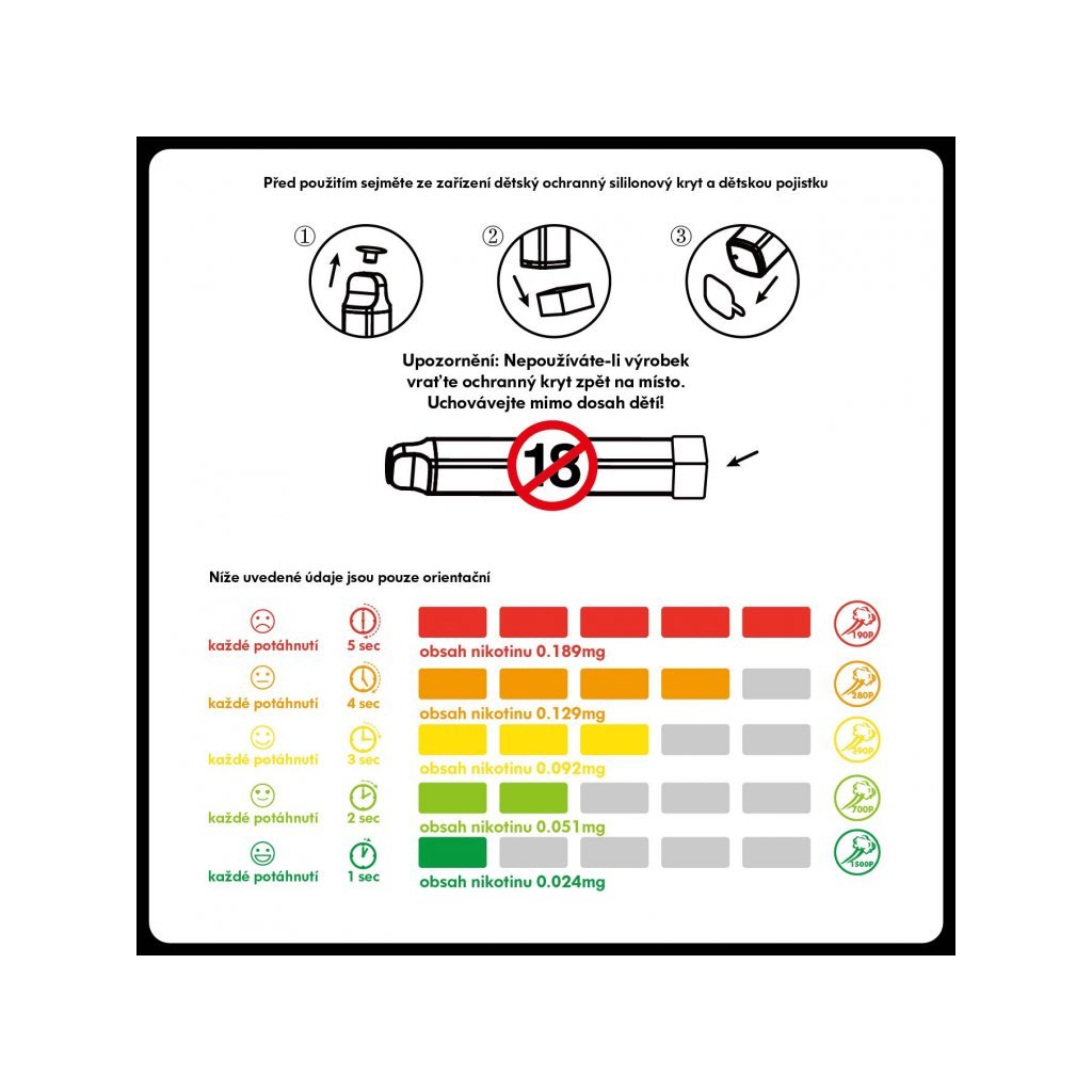 Pouze pro osoby starší 18 let. Tento výrobek obsahuje nikotiny, který je vysoce návykovou látkou. Jeho užití se nekuřáky nedoporučuje.